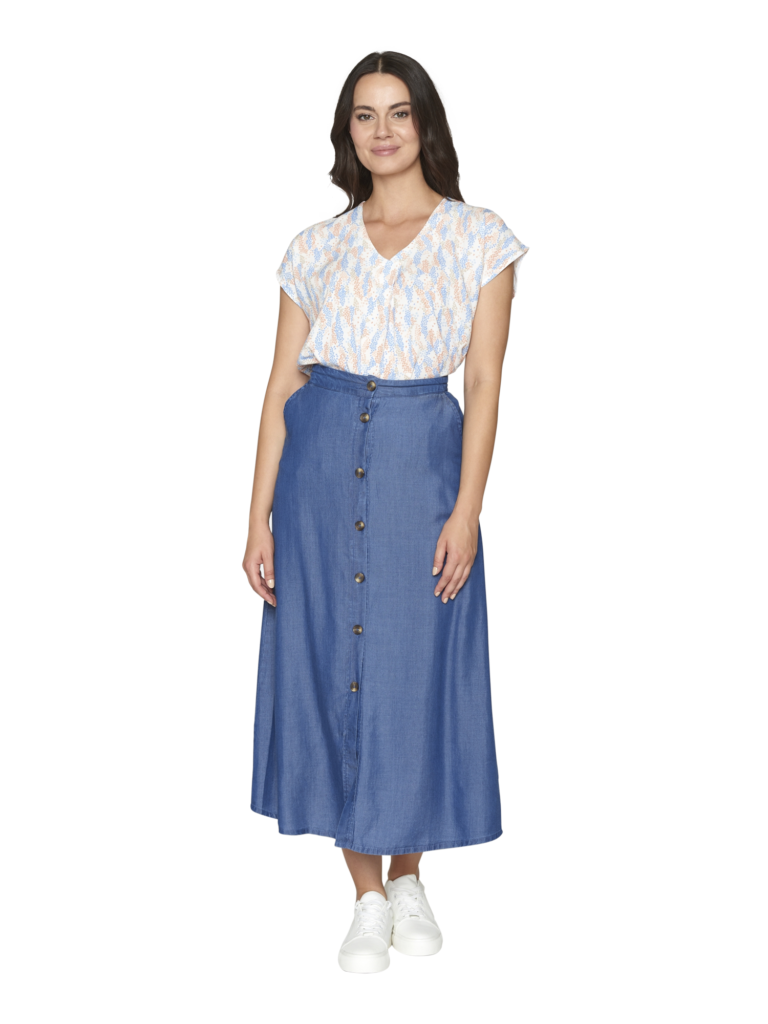 Beskrivelse Lang nederdel i tencel fra B.Copenhagen. Denne nederdel er er med linning og er gennemknappet ned foran med hornlignende knapper. Der er skrålommer i sidesømmen. Der er god vidde nedom, og denne nederdel er super smart. 100% Lyocell |